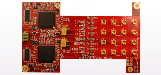 The AV909 is a Dual video decoder, AVXB expansion card. The AV909 utilises two Philips SAA7118 video decoder, which supports a wide variety of analogue inputs. Using both decoders up to 16 inputs can be utilised. As the 16 inputs are shared between 2 video decoders simultaneous capture of 2 channels is possible